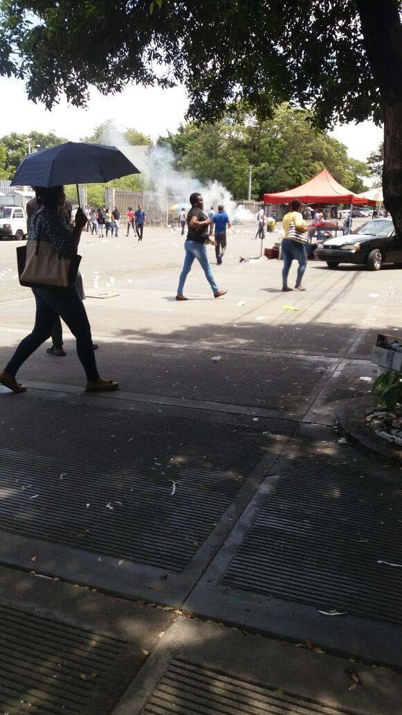 Estudiantes de la Universidad Autónoma de Santo Domingo (UASD) se enfrentan la tarde de este lunes a tropas de la Policía Nacional luego de movilizarse en respaldo al paro de 24 horas en las 14 provincias del Cibao.