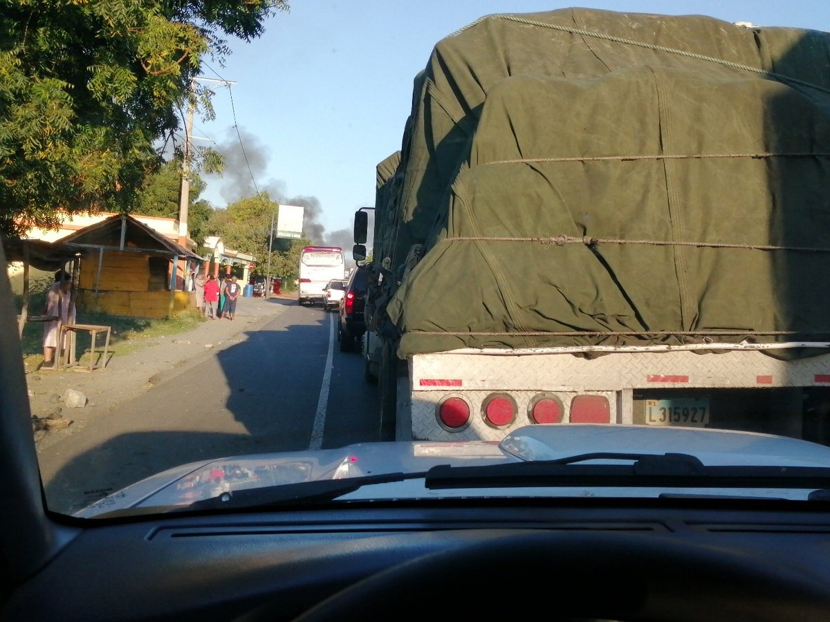 Larga fila de vehículos se puede observar, mientras miembros de la policía local y los bomberos se dirigen hacia el lugar para quitar los escombros un apagar los neumáticos que arden cual infierno de Dante.