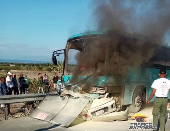 De acuerdo a versiones, el carro, que funcionaba con gas licuado de petróleo, chocó al autobús, y ambos vehículos se incendiaron.